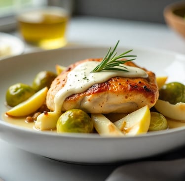Golden-seared chicken bathes in a rosemary cream sauce that clings to charred Brussels sprouts and thin, tart apple accents. The pan deglaze pulls up every browned bit, building a sauce that’s herbaceous, savory, and subtly sweet without tipping into dessert territory. Each bite is contrasting texture: juicy chicken, crisp-edged sprouts, and soft, perfumed apple.