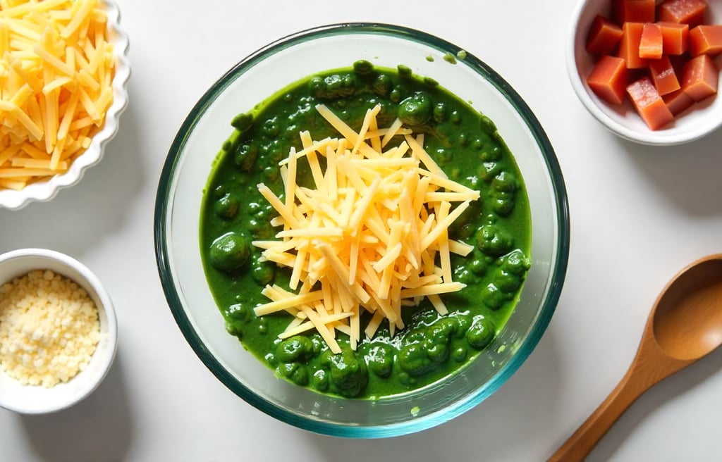 Add Cheese & Filling: Stir in shredded cheese, Parmesan, and the cooled spinach mixture. Mix until evenly combined. (If using bacon, ham, or veggies, fold them in now.)