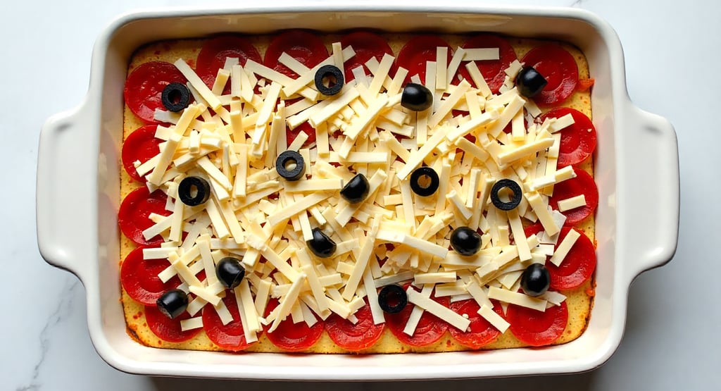 Assemble the Casserole: Spread the meat sauce evenly over the baked zucchini crust. Top with shredded mozzarella, Parmesan, and your favorite keto-friendly pizza toppings (like pepperoni or veggies).